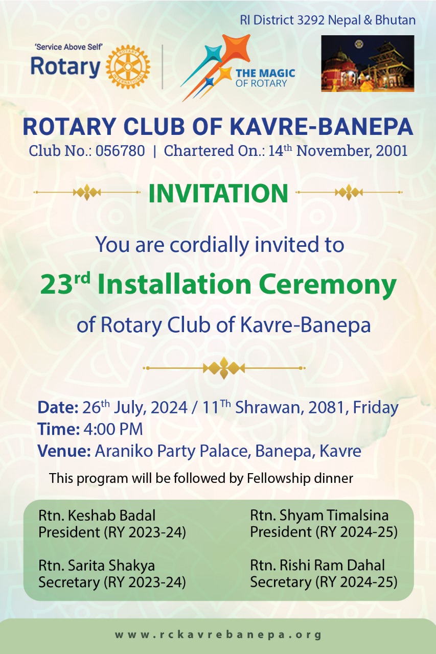Jul 19, 2024You are cordially invited to 23rd Installation Ceremony of Rotary Club of Kavre-Banepa.